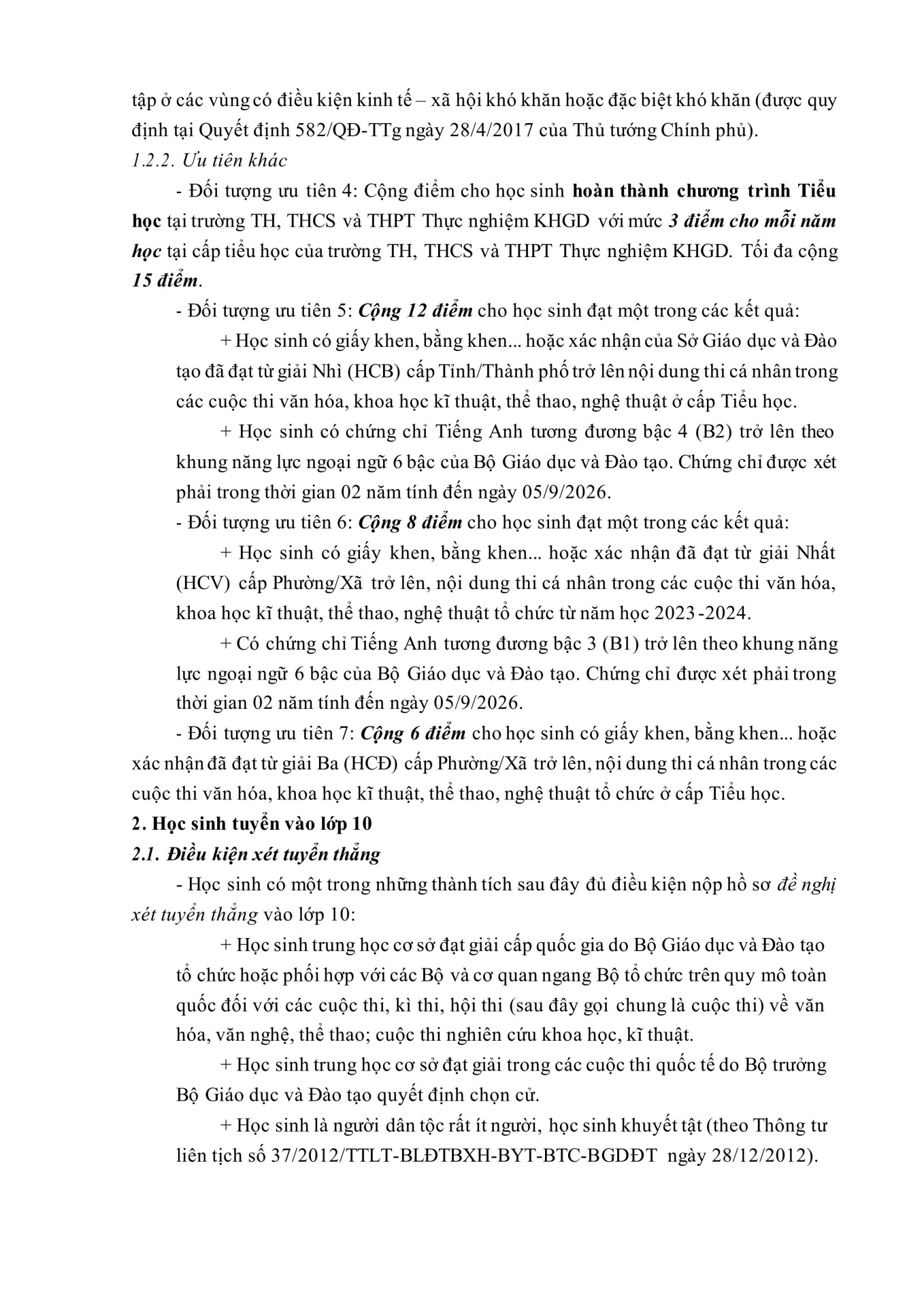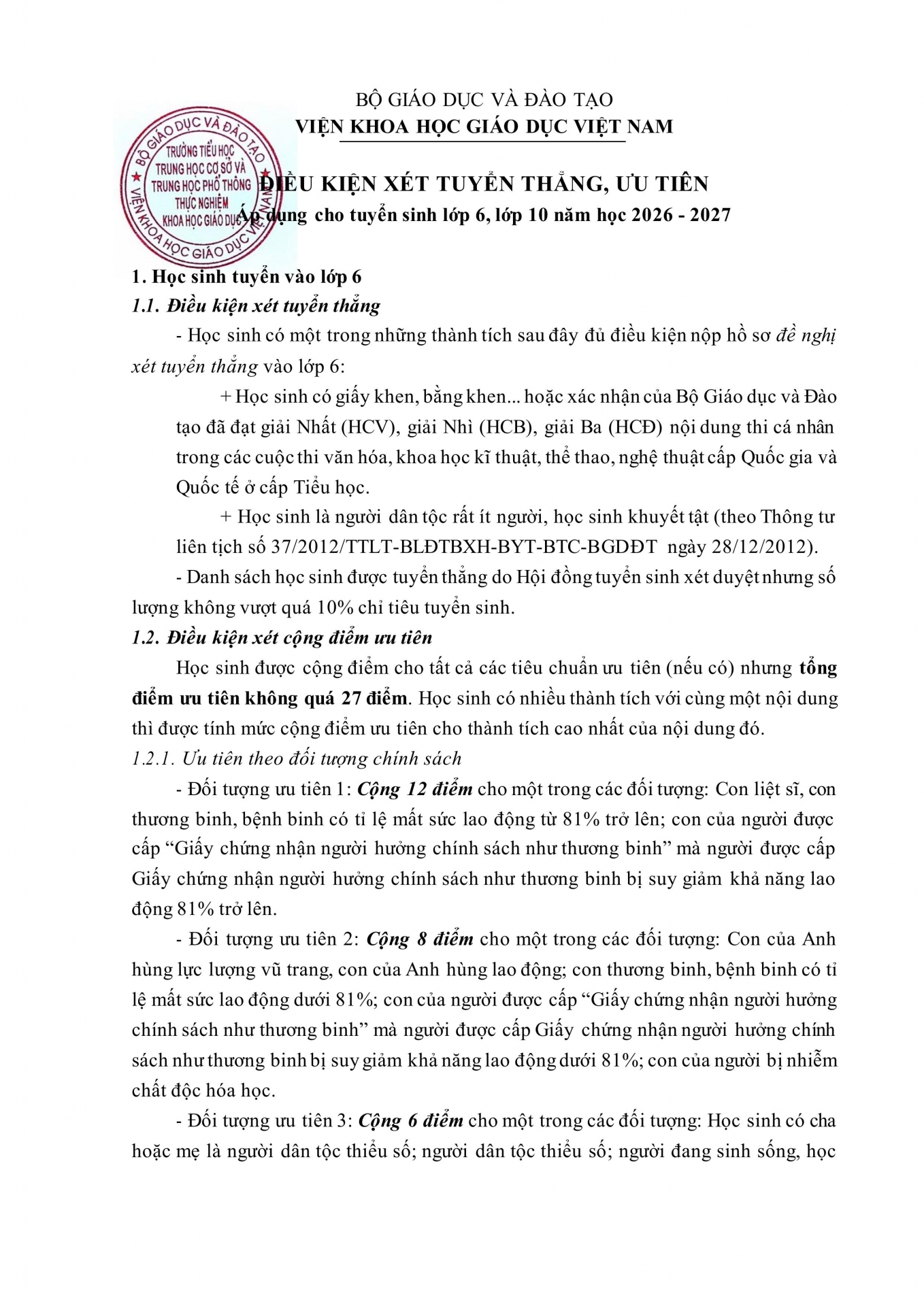 ĐIỀU KIỆN XÉT TUYỂN THẲNG, ƯU TIÊN ÁP DỤNG CHO TUYỂN SINH LỚP 6, LỚP 10 NĂM HỌC 2026-2027