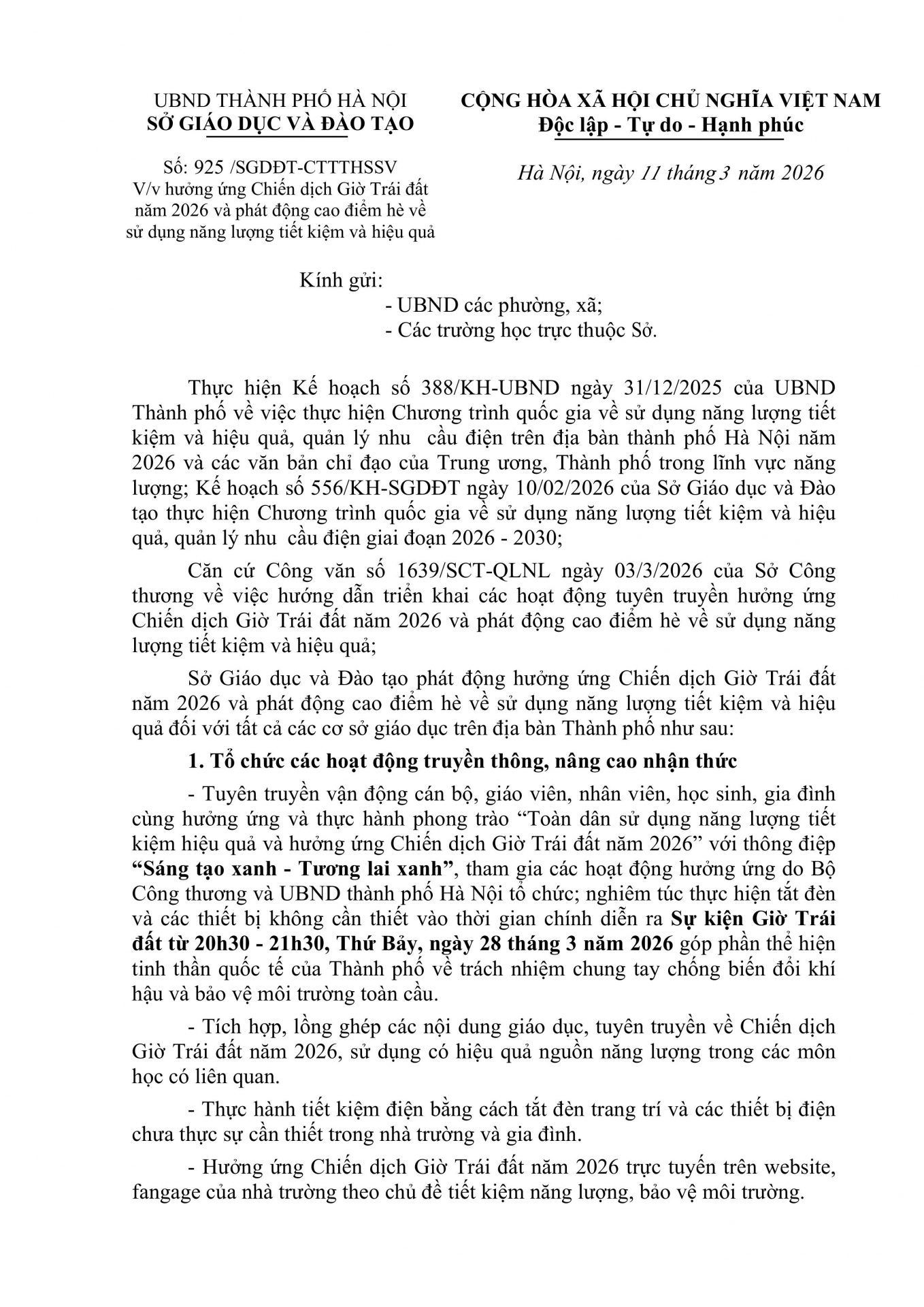 Thời gian hưởng ứng: 20h30 – 21h30, thứ Bảy, ngày 28/03/2026.
