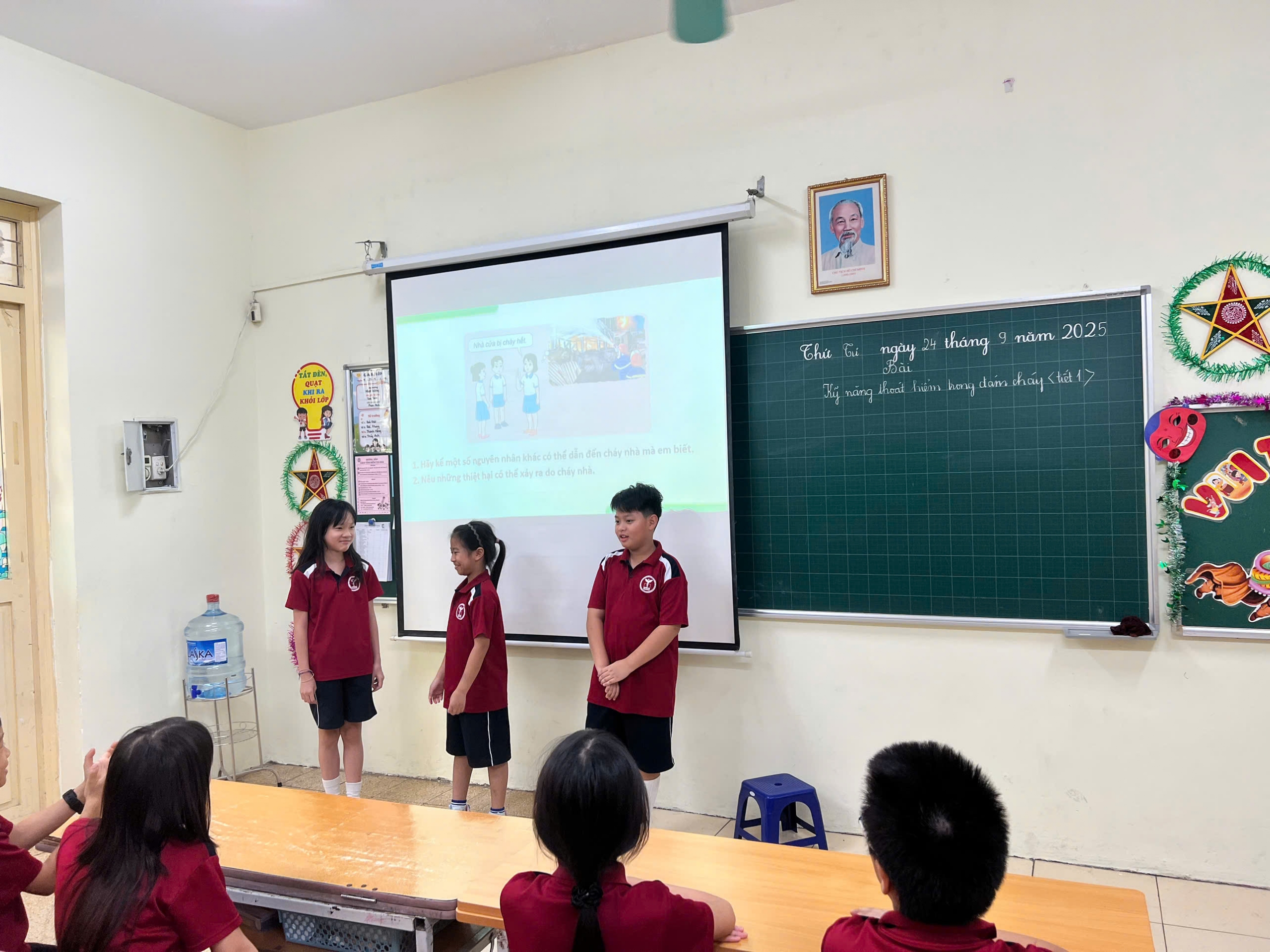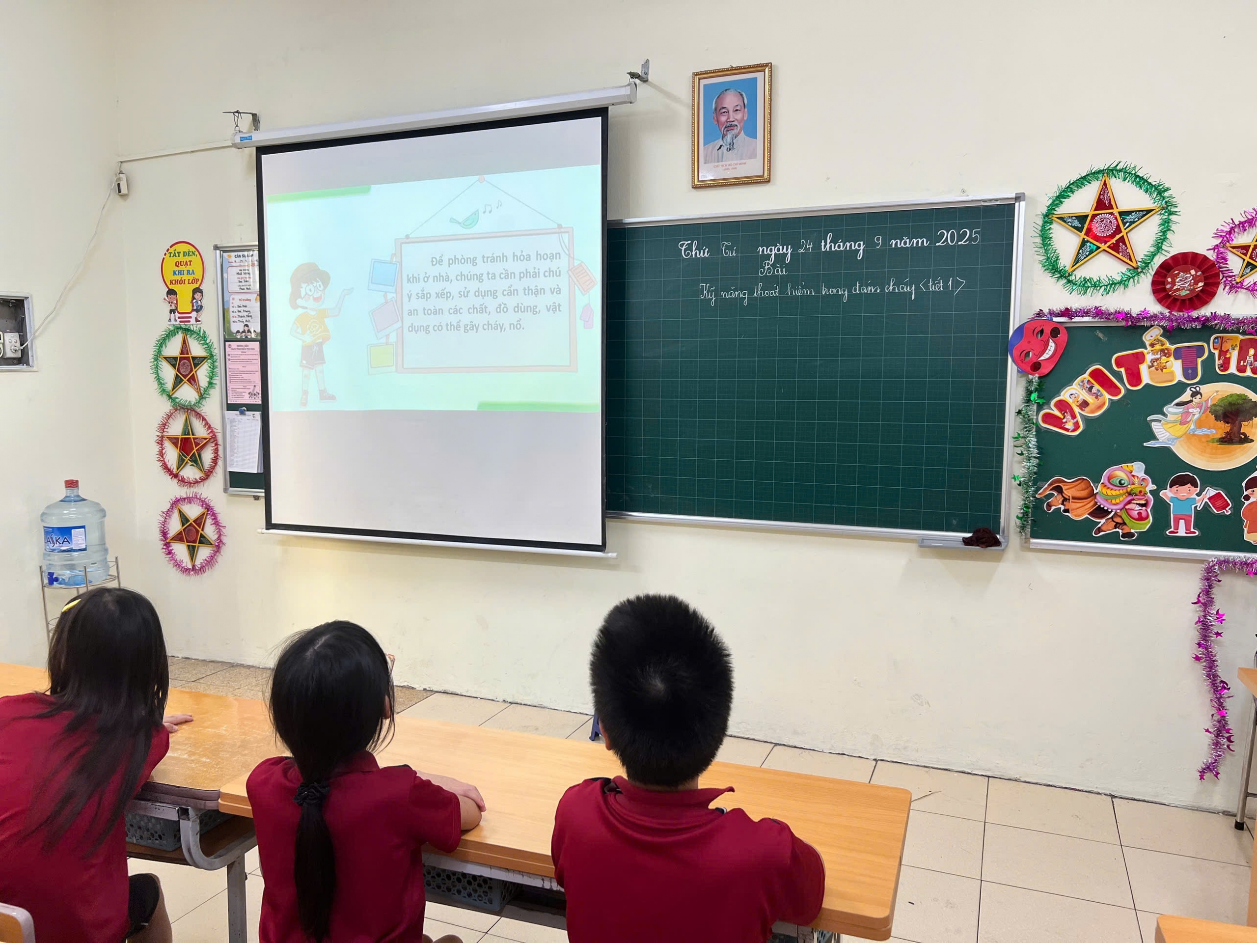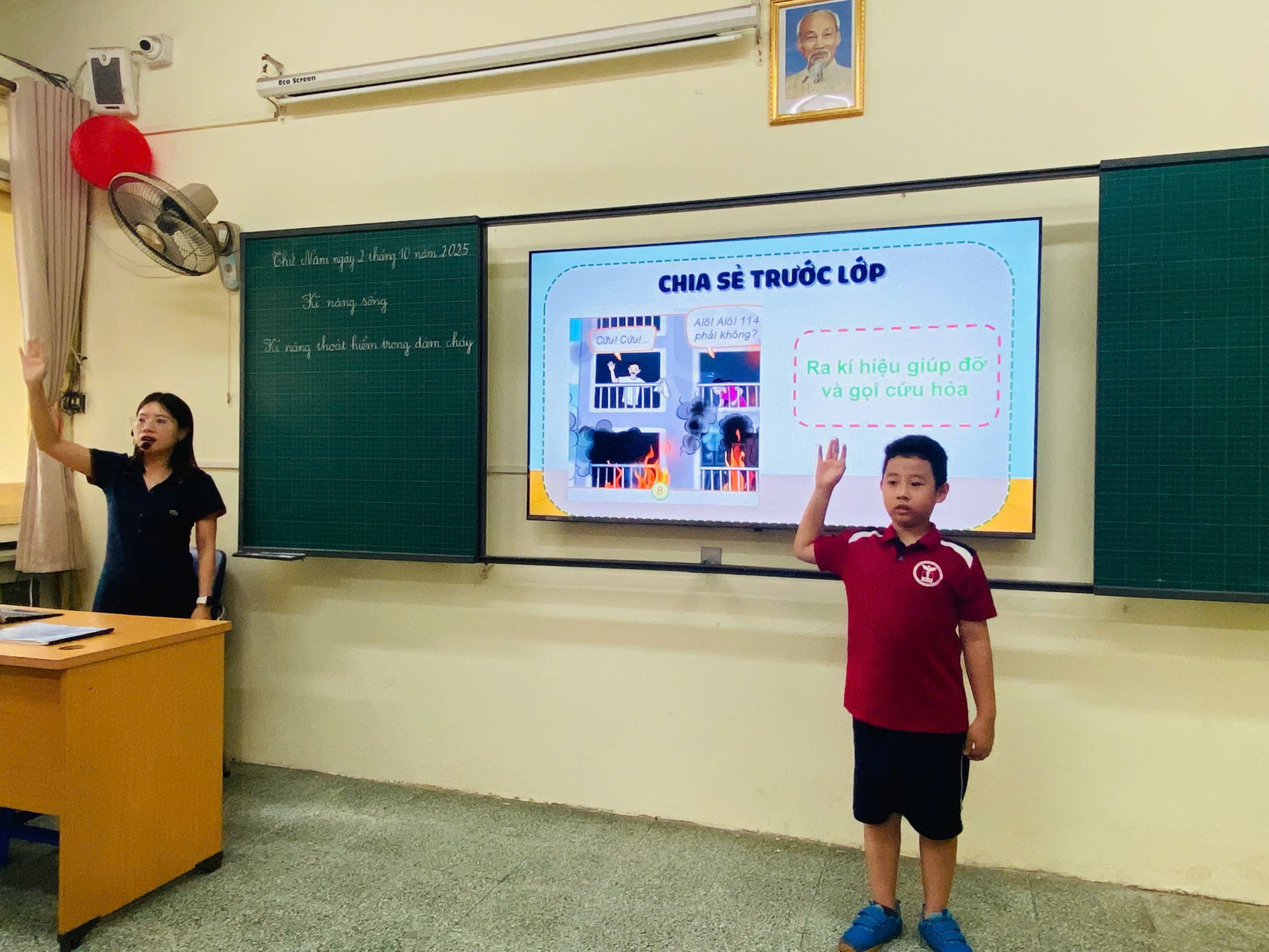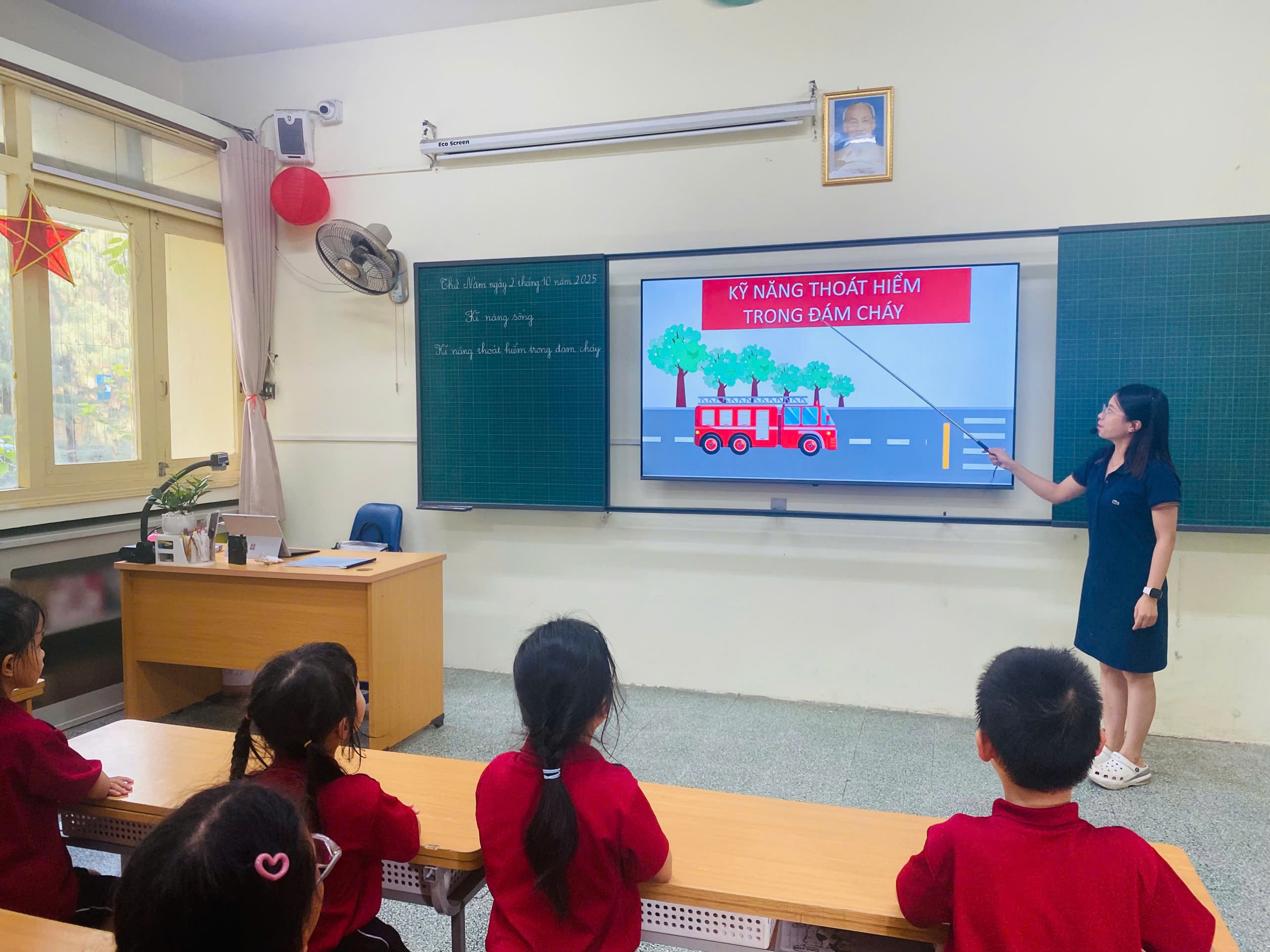 Trong các tiết Kĩ năng sống, các em đã được xem clip hướng dẫn “Kỹ năng thoát nạn cho trẻ trong đám cháy”, từ đó thực hành nhận biết nguy cơ và lựa chọn hướng di chuyển an toàn. Cùng với đó, hoạt động vẽ tranh cổ động hưởng ứng Ngày Toàn dân PCCC và trưng bày sản phẩm tại bảng tin được triển khai theo tinh thần công văn hướng dẫn.