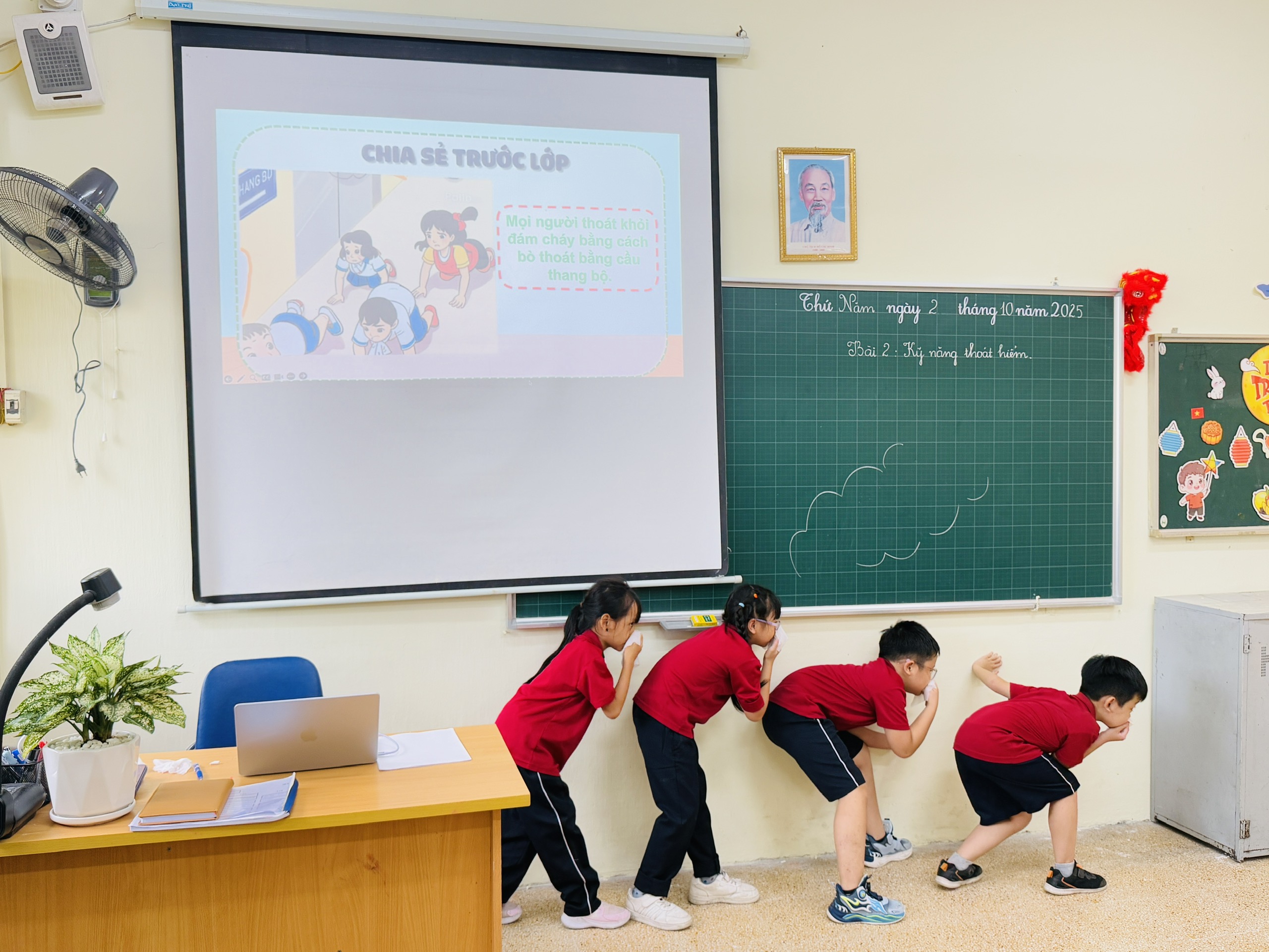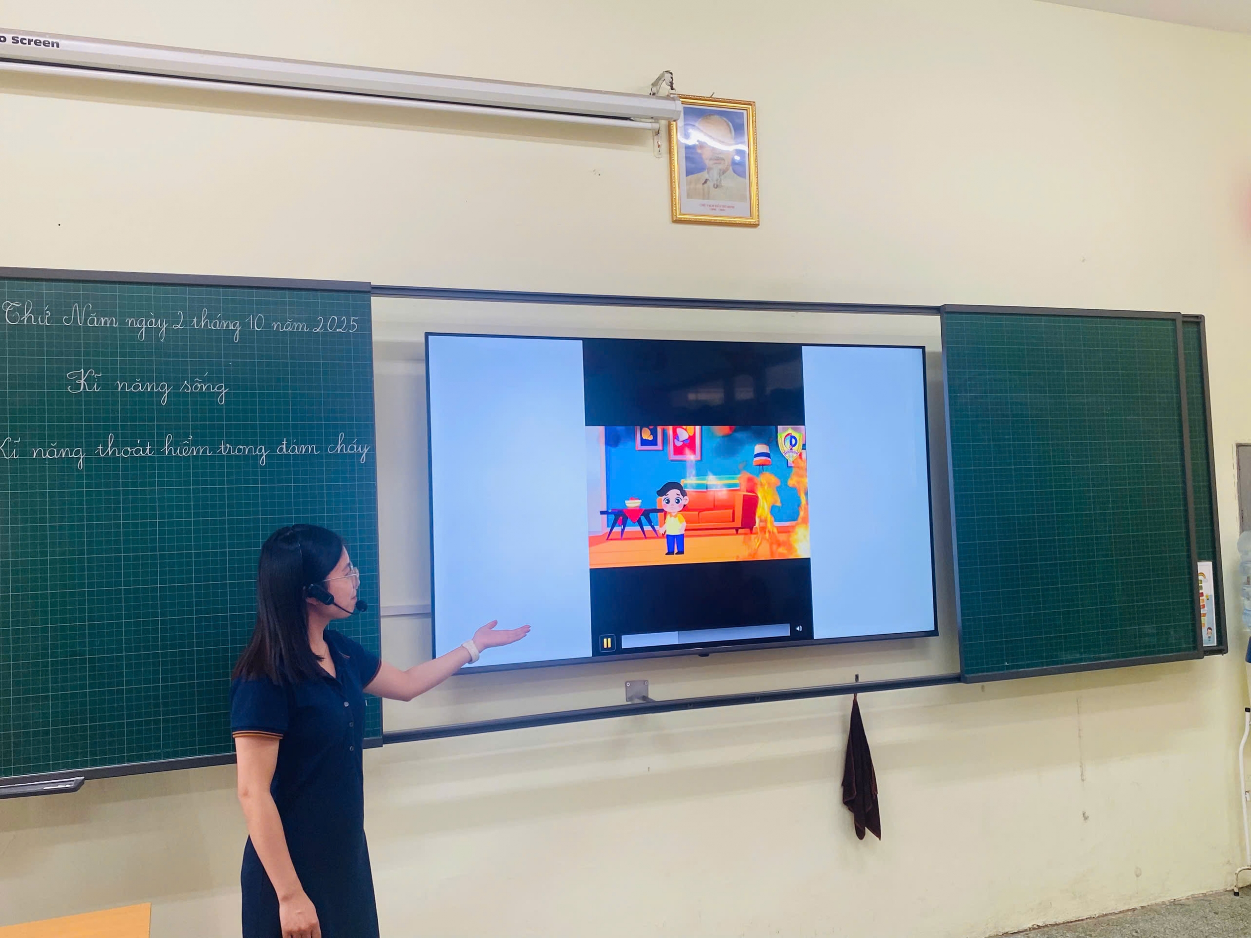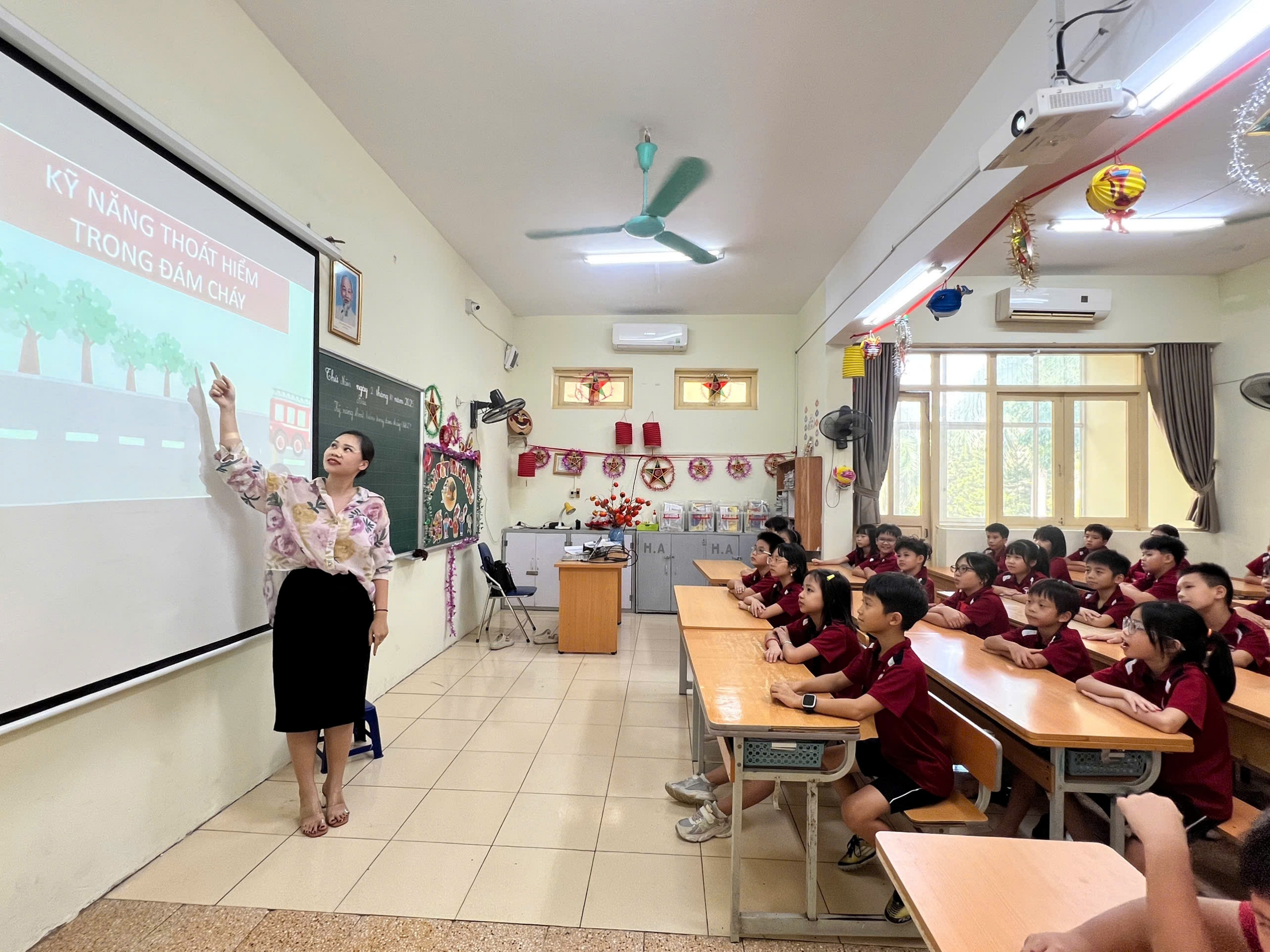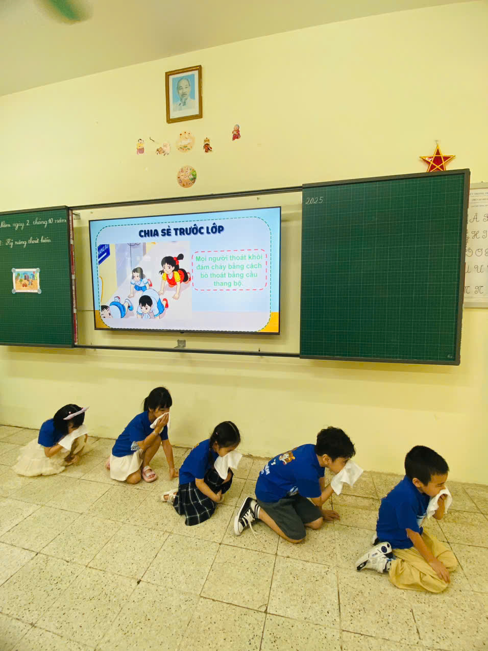 Trong các tiết Kĩ năng sống, các em đã được xem clip hướng dẫn “Kỹ năng thoát nạn cho trẻ trong đám cháy”, từ đó thực hành nhận biết nguy cơ và lựa chọn hướng di chuyển an toàn. Cùng với đó, hoạt động vẽ tranh cổ động hưởng ứng Ngày Toàn dân PCCC và trưng bày sản phẩm tại bảng tin được triển khai theo tinh thần công văn hướng dẫn.