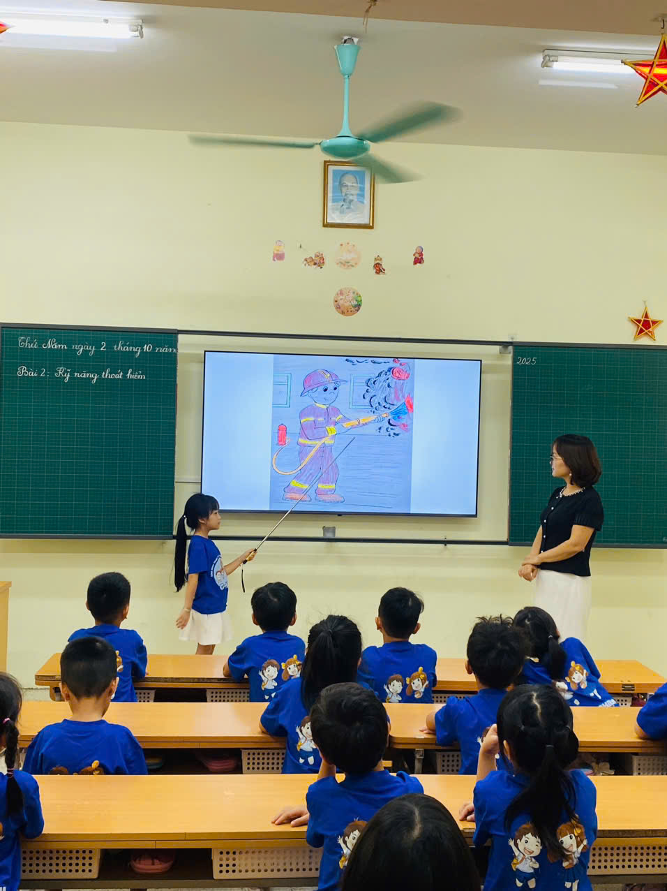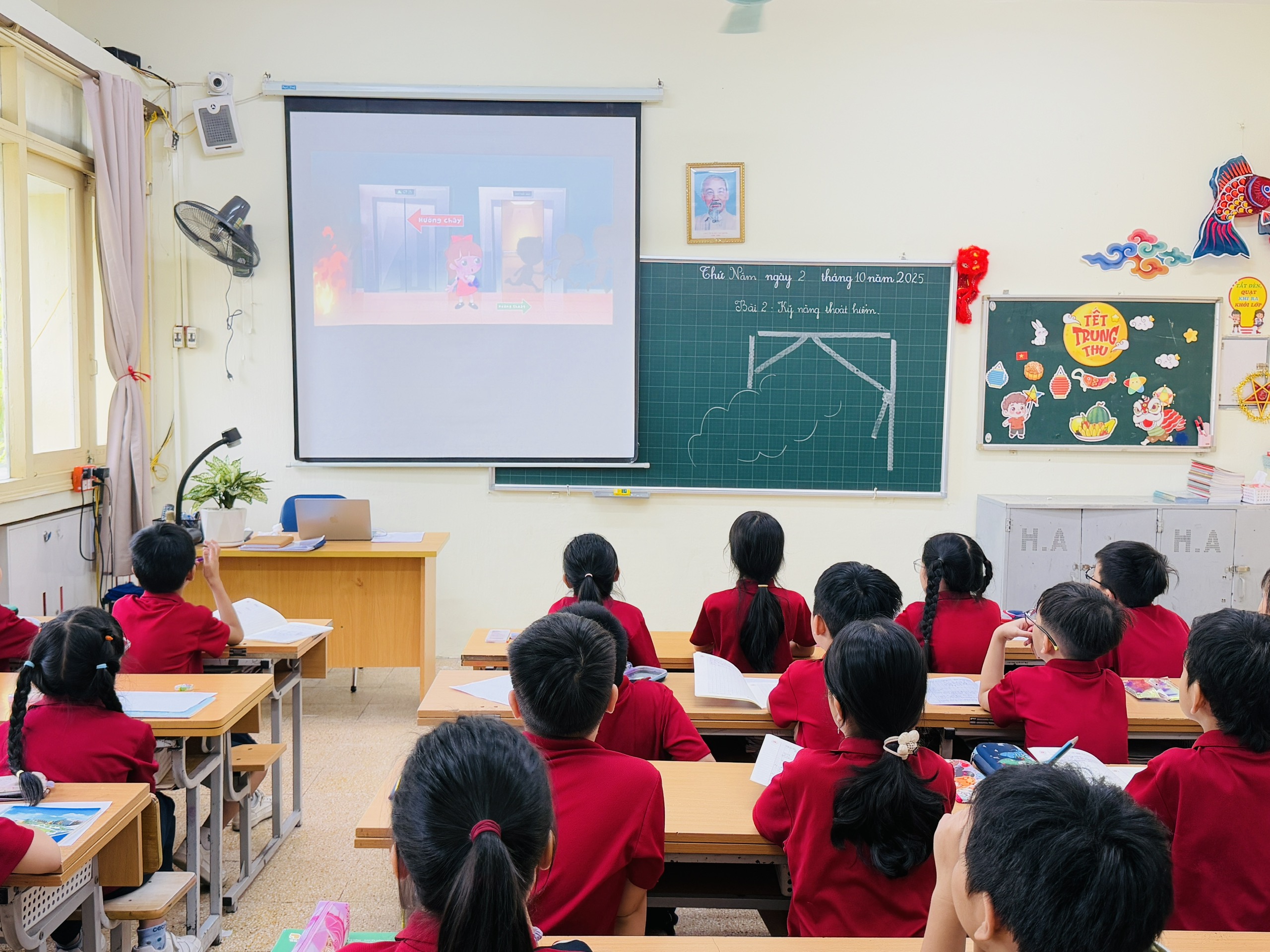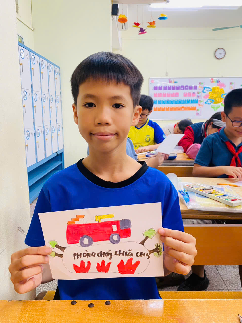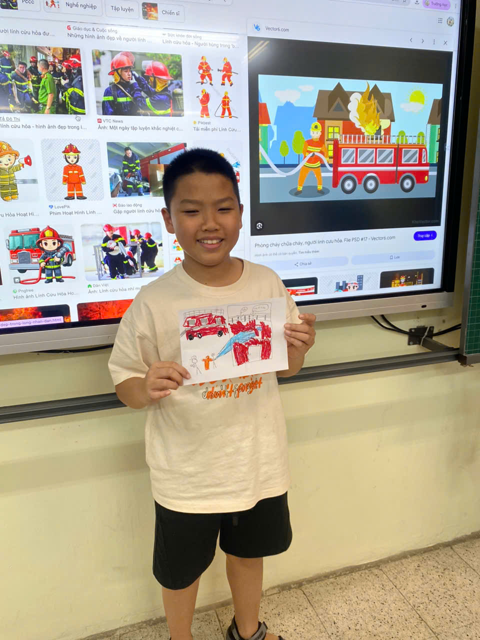 Trong các tiết Kĩ năng sống, các em đã được xem clip hướng dẫn “Kỹ năng thoát nạn cho trẻ trong đám cháy”, từ đó thực hành nhận biết nguy cơ và lựa chọn hướng di chuyển an toàn. Cùng với đó, hoạt động vẽ tranh cổ động hưởng ứng Ngày Toàn dân PCCC và trưng bày sản phẩm tại bảng tin được triển khai theo tinh thần công văn hướng dẫn.
