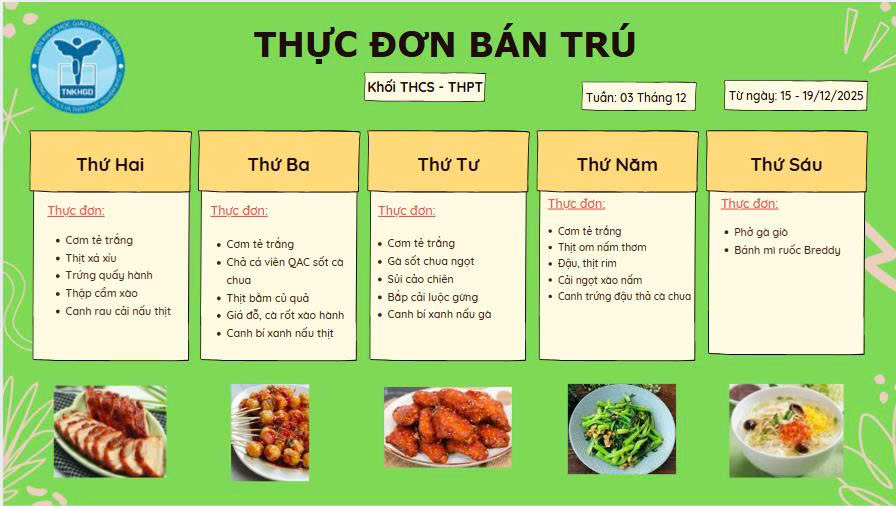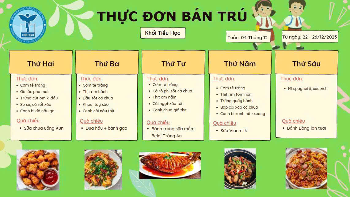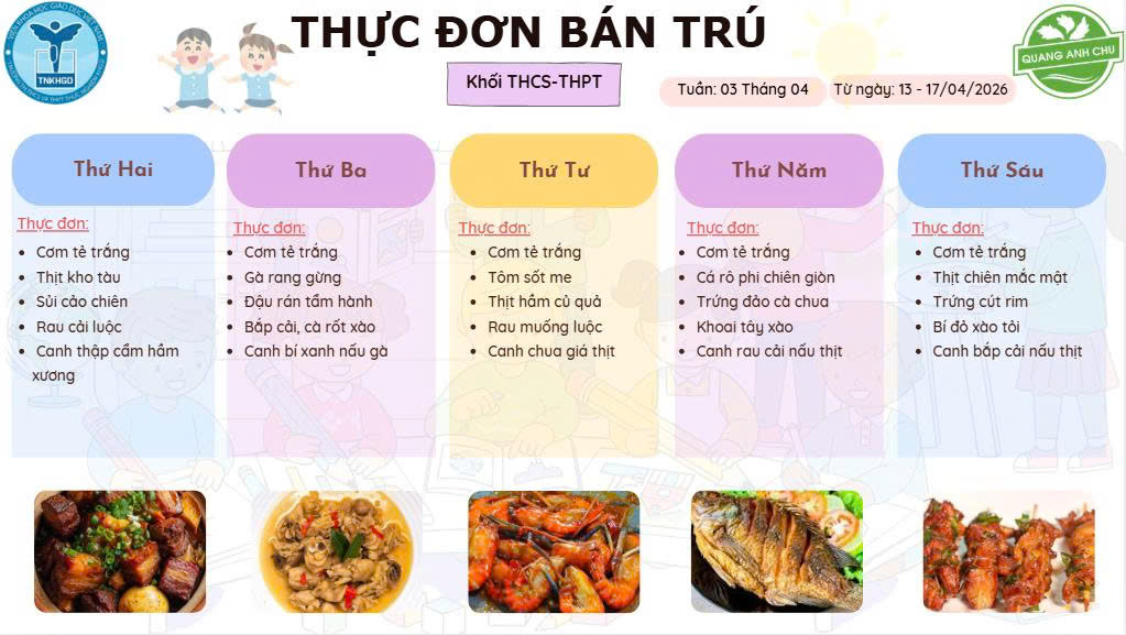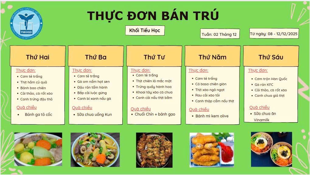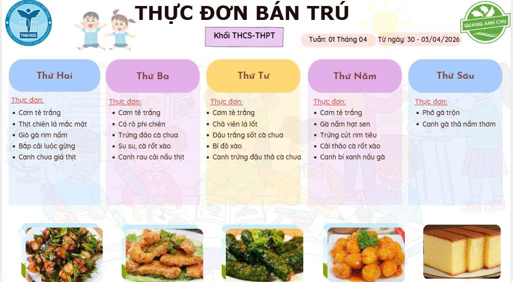 Bước vào năm học 2025 – 2026, Nhà trường tiếp tục duy trì hệ thống thực đơn được thiết kế khoa học, cân đối và phù hợp với từng lứa tuổi. Nhà trường công bố thực đơn cho cả ba cấp học. Thực đơn đã được xây dựng khoa học, tuân thủ tiêu chuẩn an toàn thực phẩm. Quý phụ huynh và học sinh cùng theo dõi chi tiết thực đơn năm học 2025 -2026: