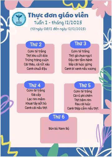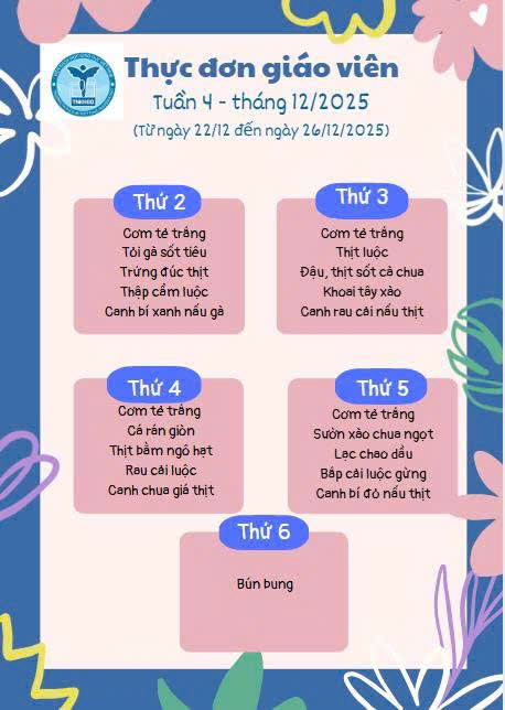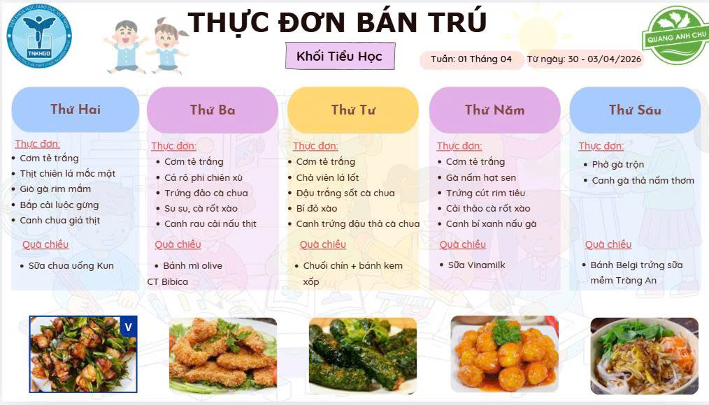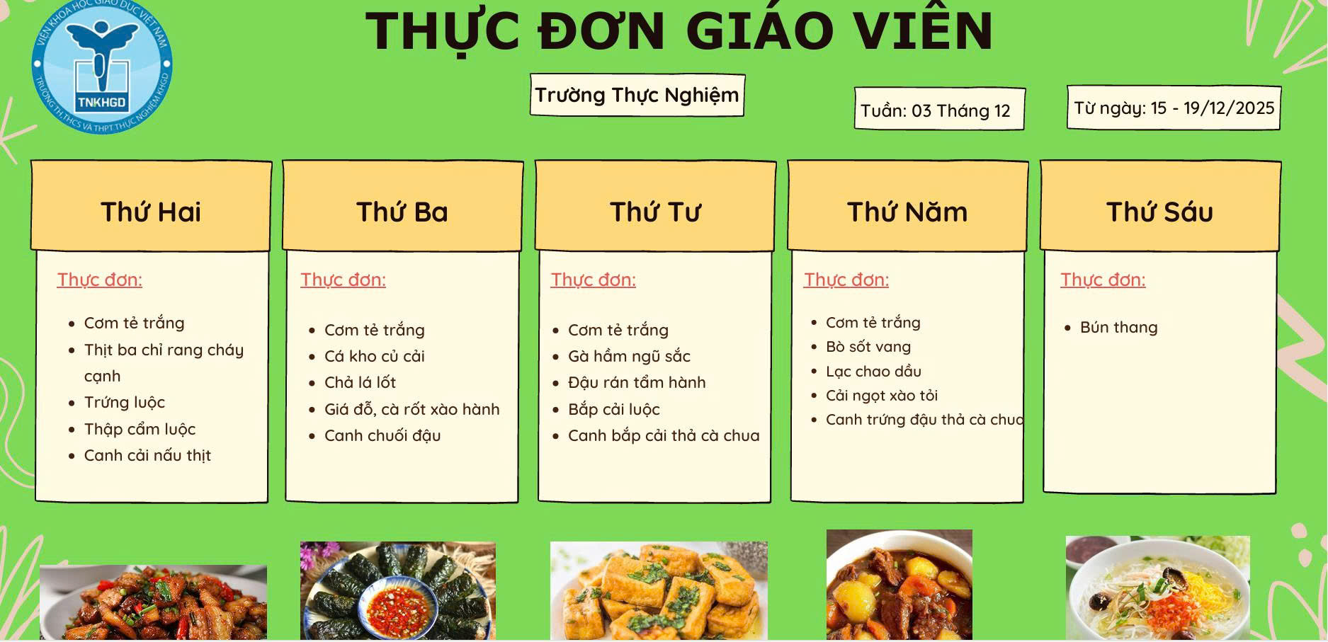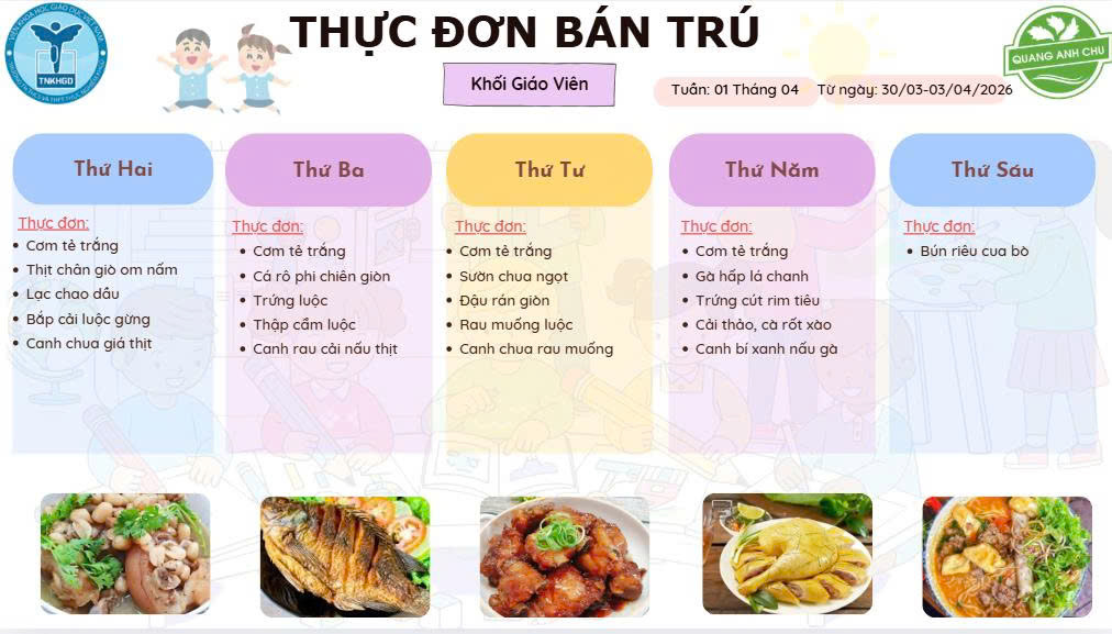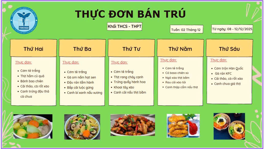 Bước vào năm học 2025 – 2026, Nhà trường tiếp tục duy trì hệ thống thực đơn được thiết kế khoa học, cân đối và phù hợp với từng lứa tuổi. Nhà trường công bố thực đơn cho cả ba cấp học. Thực đơn đã được xây dựng khoa học, tuân thủ tiêu chuẩn an toàn thực phẩm. Quý phụ huynh và học sinh cùng theo dõi chi tiết thực đơn năm học 2025 -2026: